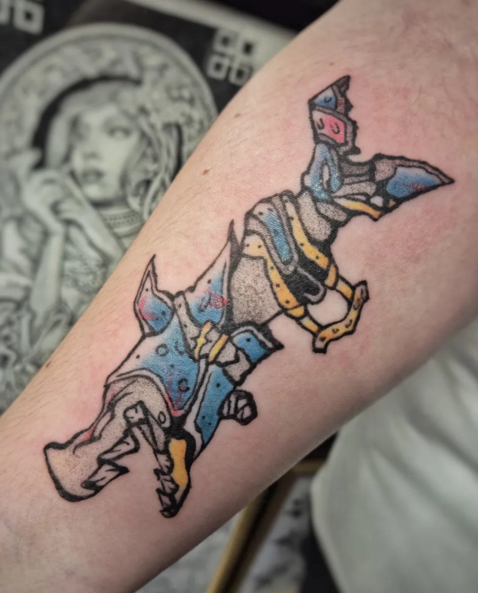 Grande adepte (accro) de jeux vidéo, d’héroic fantasy, de jeux de rôle et de Cosplay, Captain Elenwe mélange ces univers avec des influences de tatouage traditionnel et de blackwork.